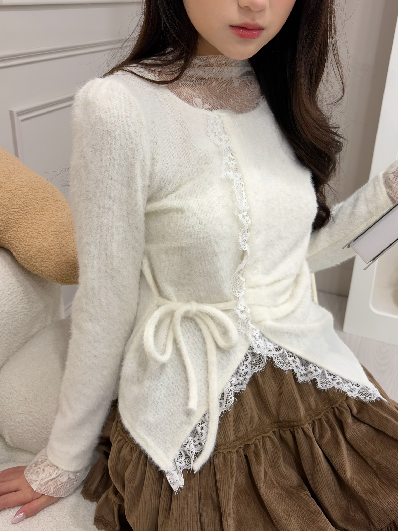 領口跟袖口有拼接蝴蝶結蕾絲做假兩件效果